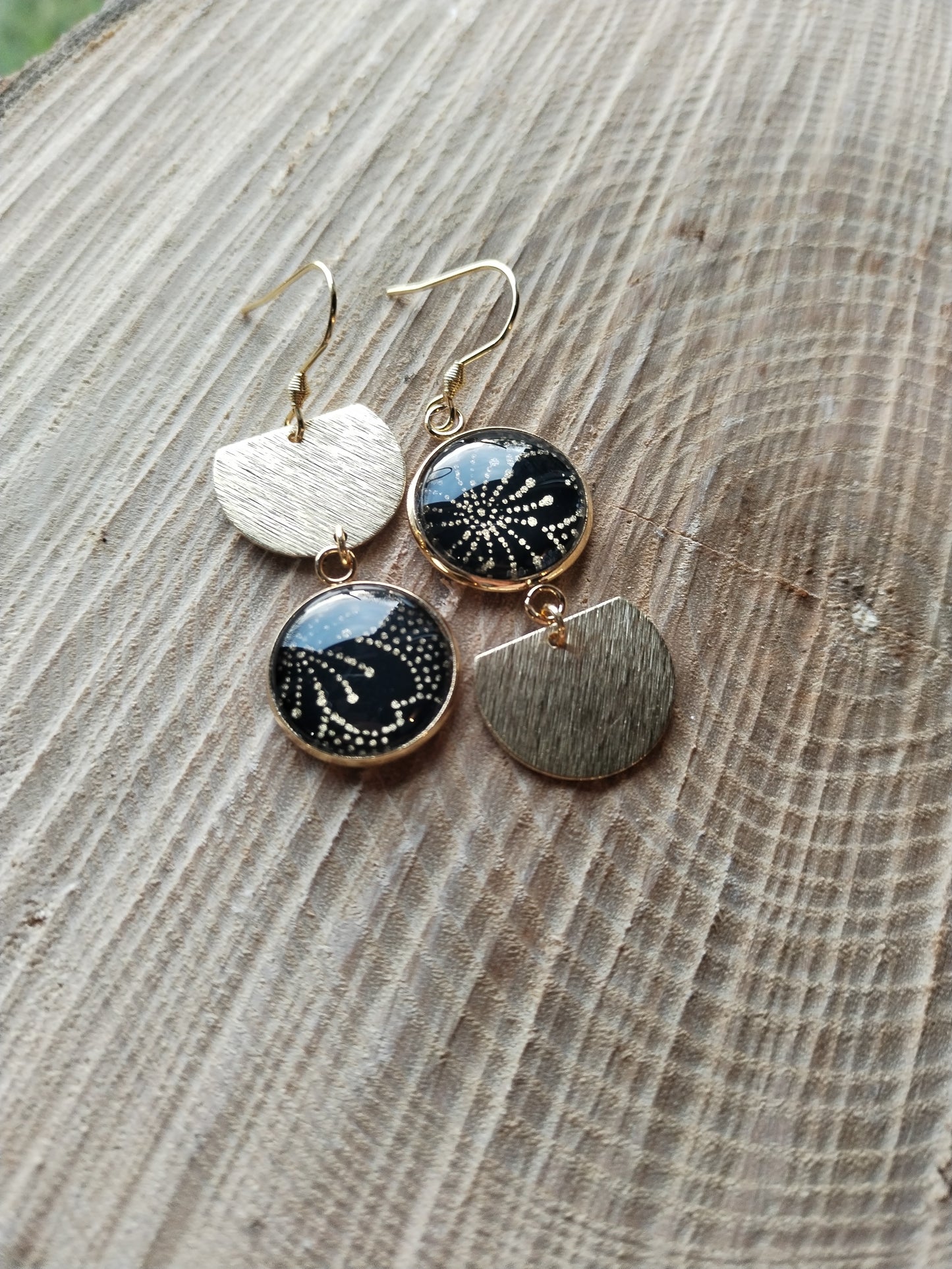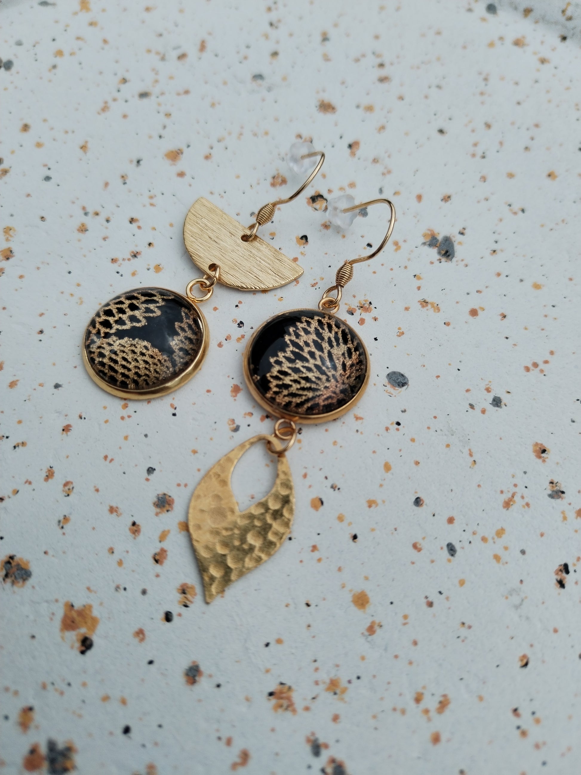 Boucles d'oreilles asymétriques - Cabochons 16mm - Acier inoxydable doré - Florales noires et dorées