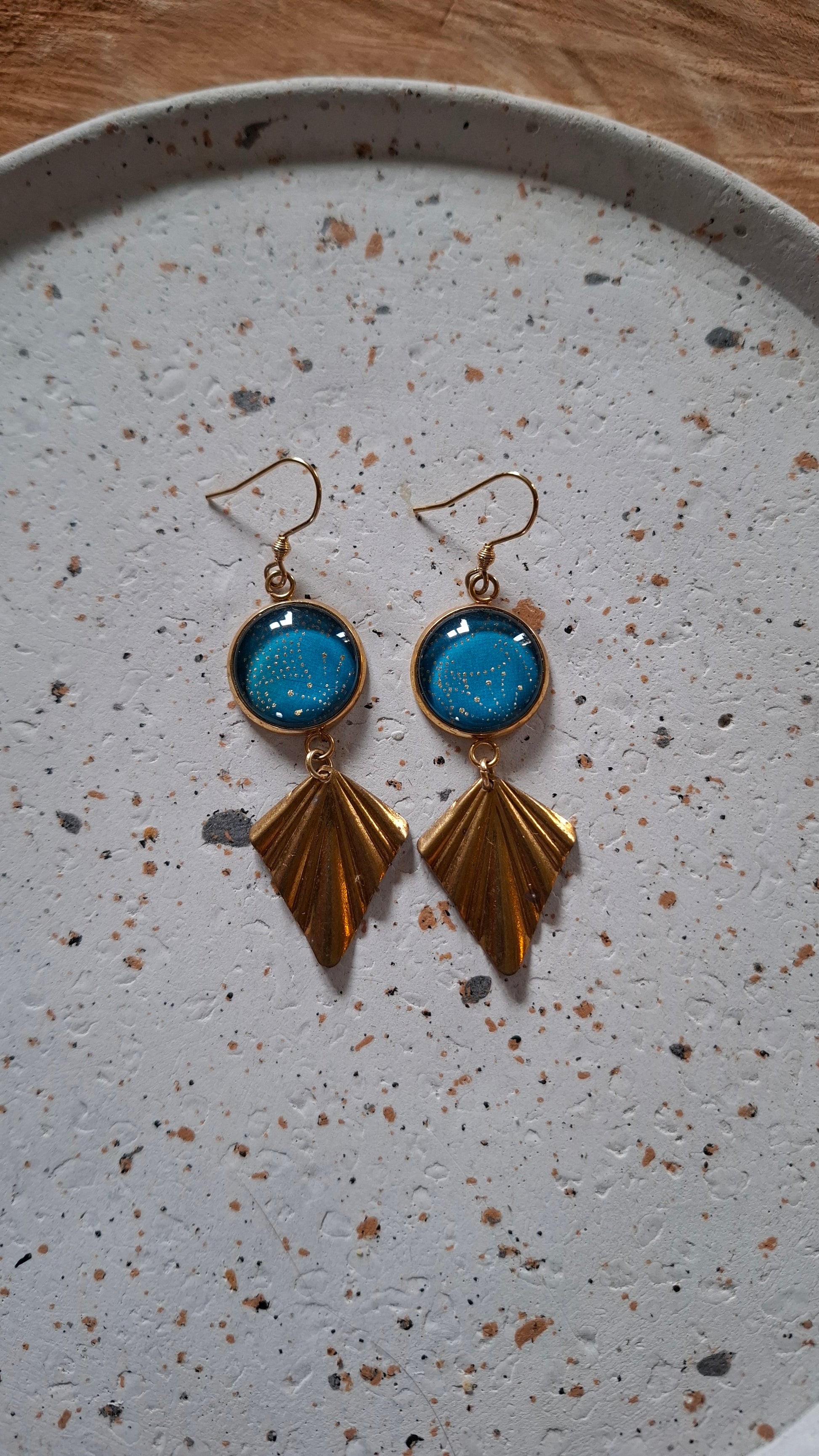 Boucles d'oreilles cabochons ronds 16mm - Acier inoxydable doré - papier japonais bleu petrol, pois dorés - breloque losange