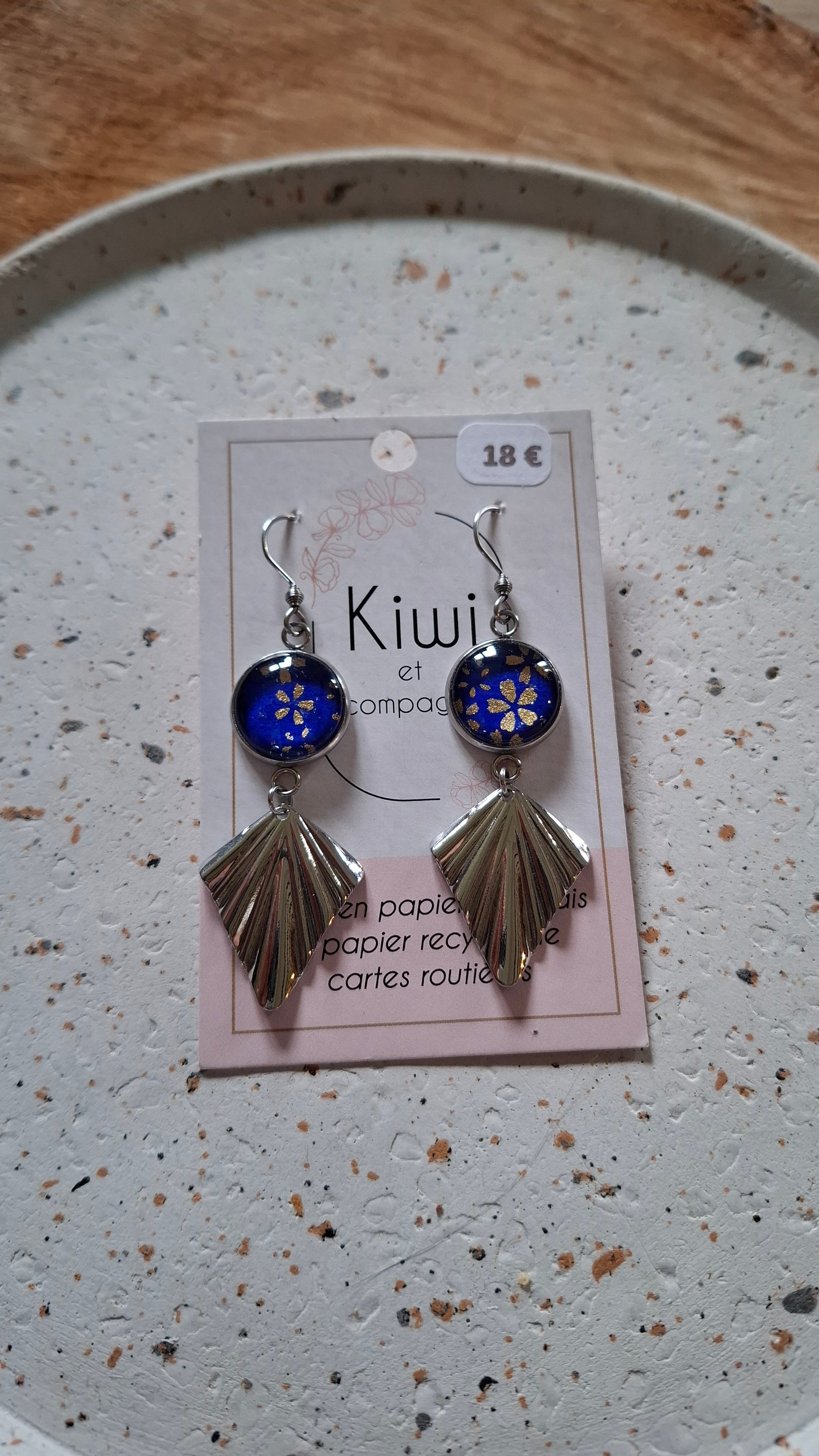 Boucles d'oreilles cabochons ronds 16mm - Acier inoxydable - papier japonais bleu floral - breloque losange