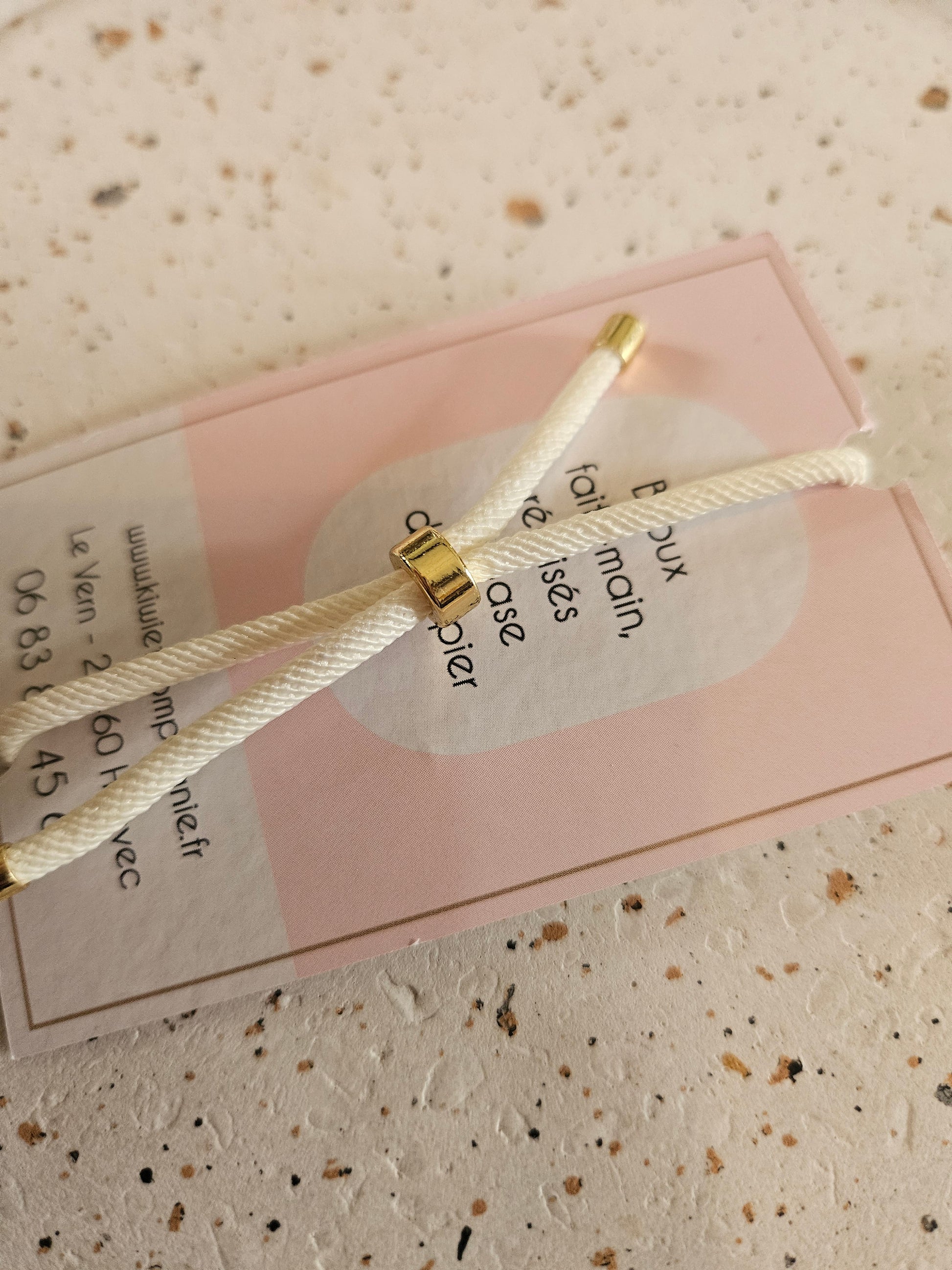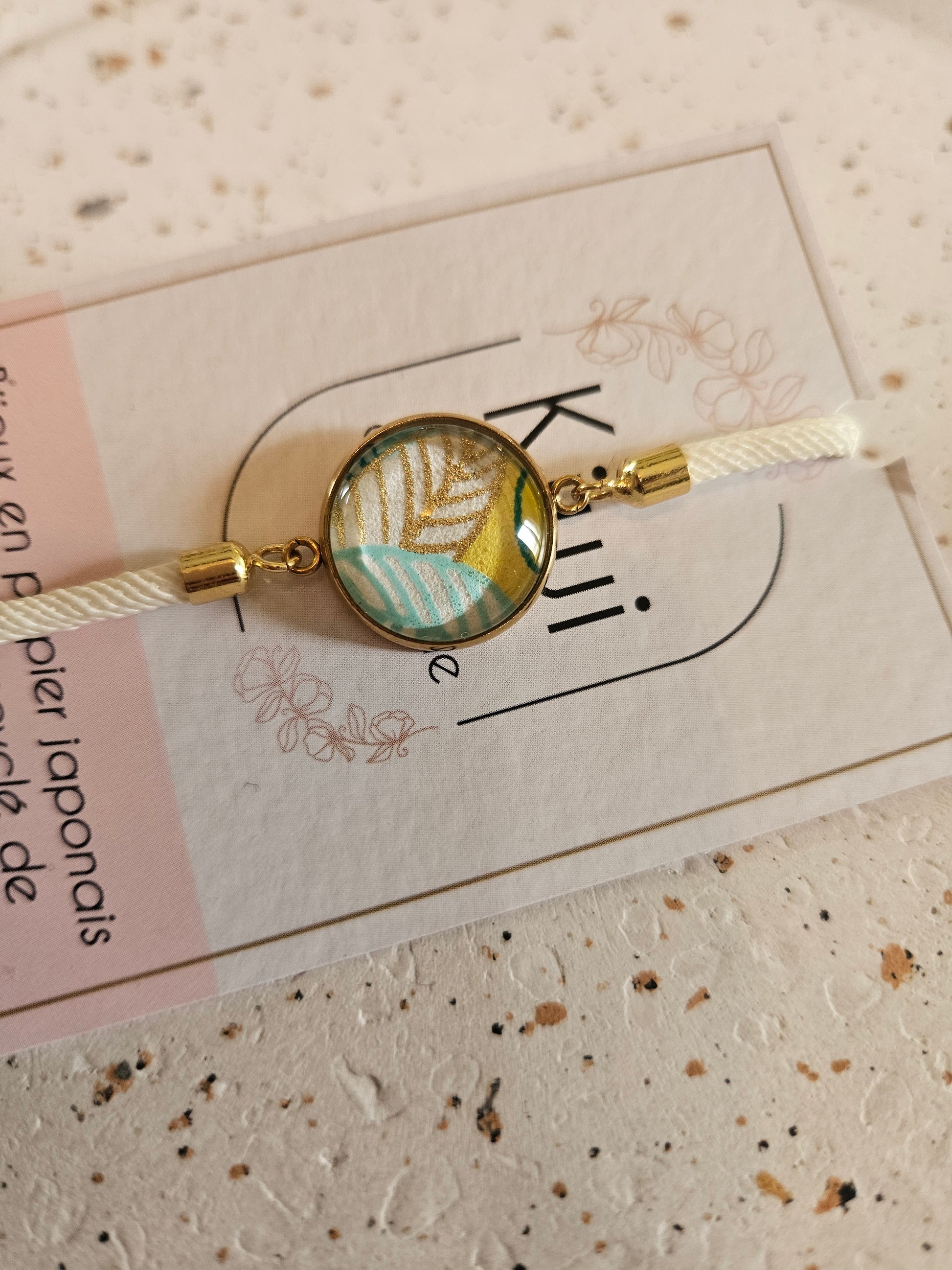Bracelet réglable en coton blanc - cabochon feuillage dore et vert