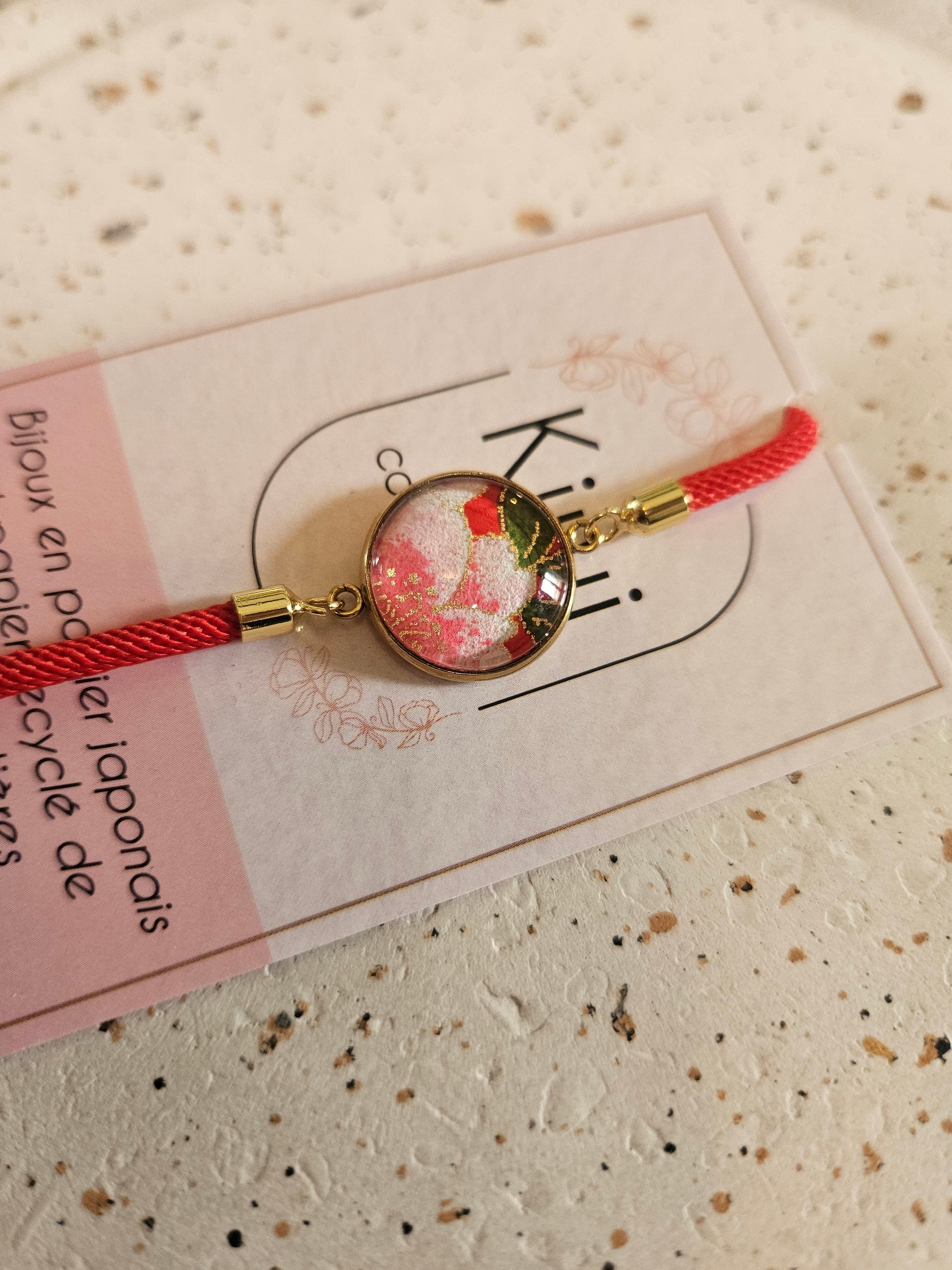 Bracelet réglable en coton rouge - cabochon rouge fleur rose