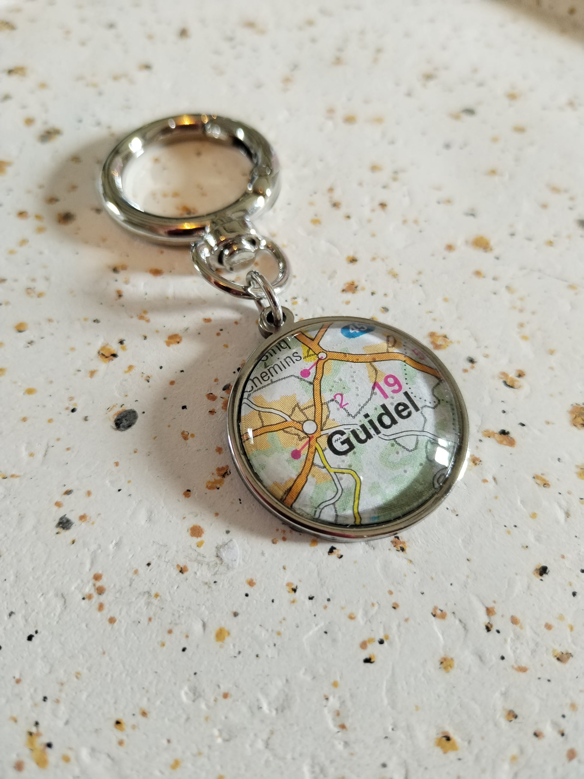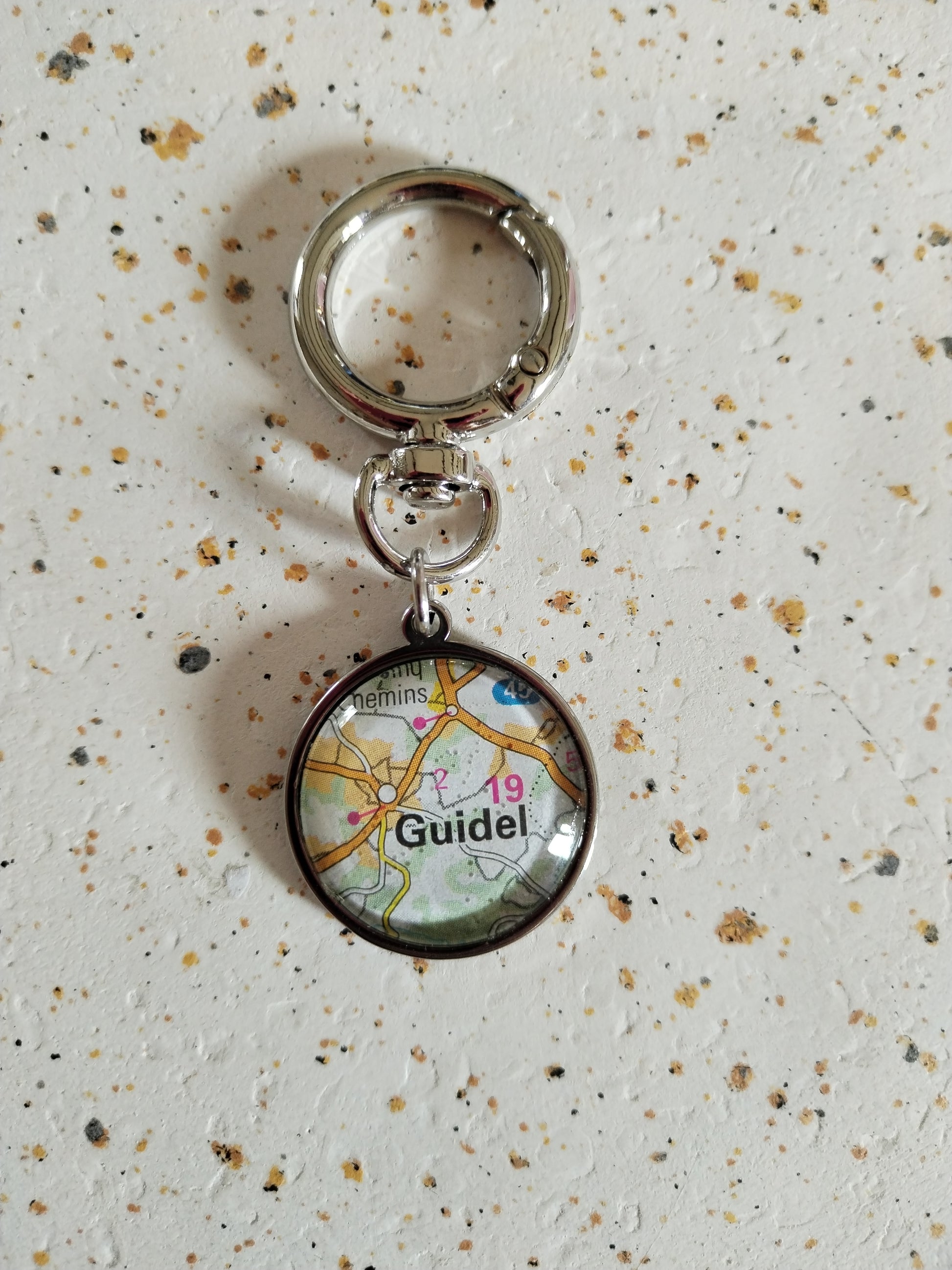 Ce porte-clé unique de 25 mm de diamètre, issu du recyclage de cartes routières, met en lumière Guidel, une ville emblématique de Bretagne. Personnalisez-le avec la ville de votre choix pour un souvenir unique et sur mesure !