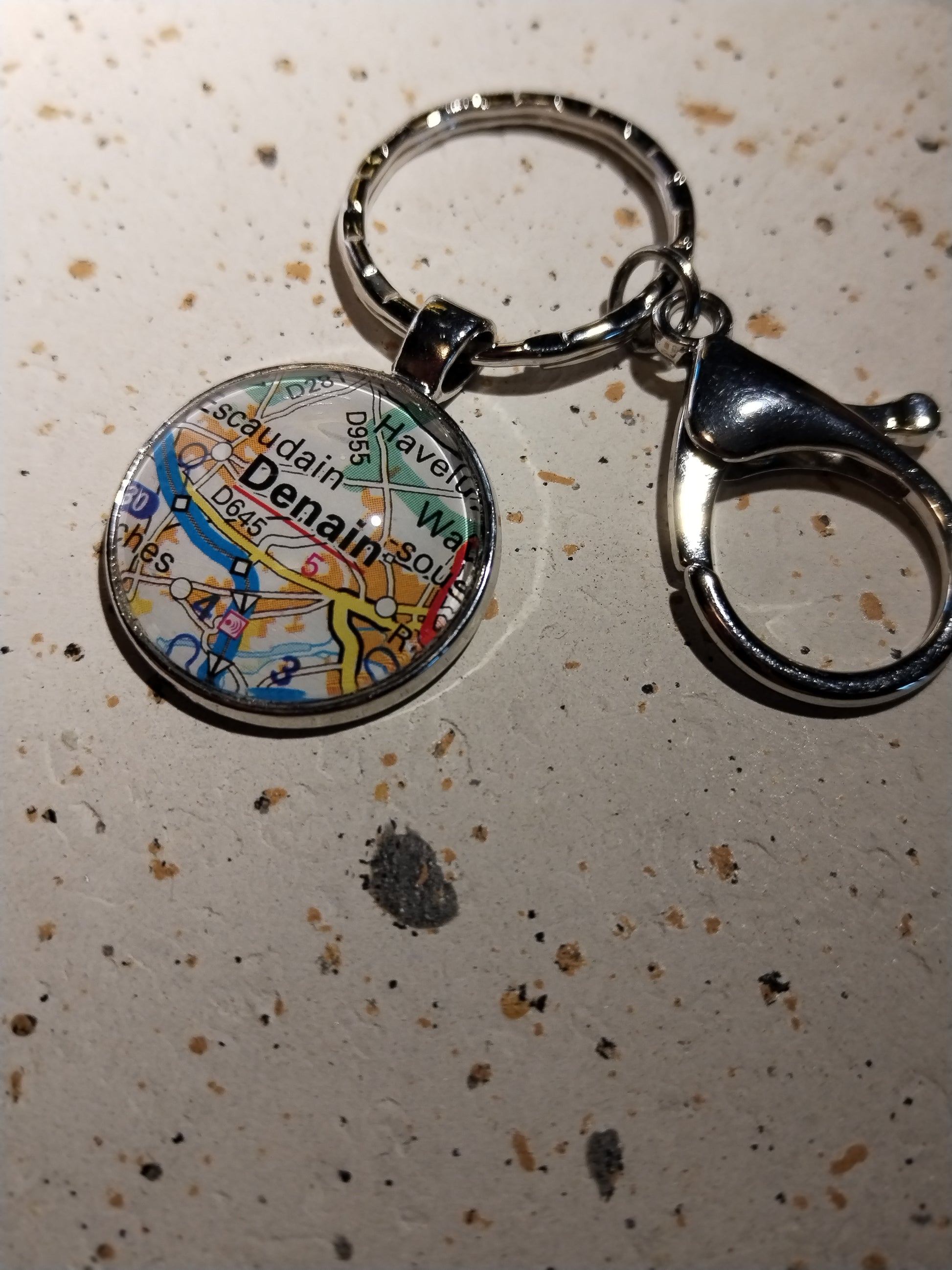 Porte-clefs cabochon 25mm - Recyclage carte routière - DENAIN